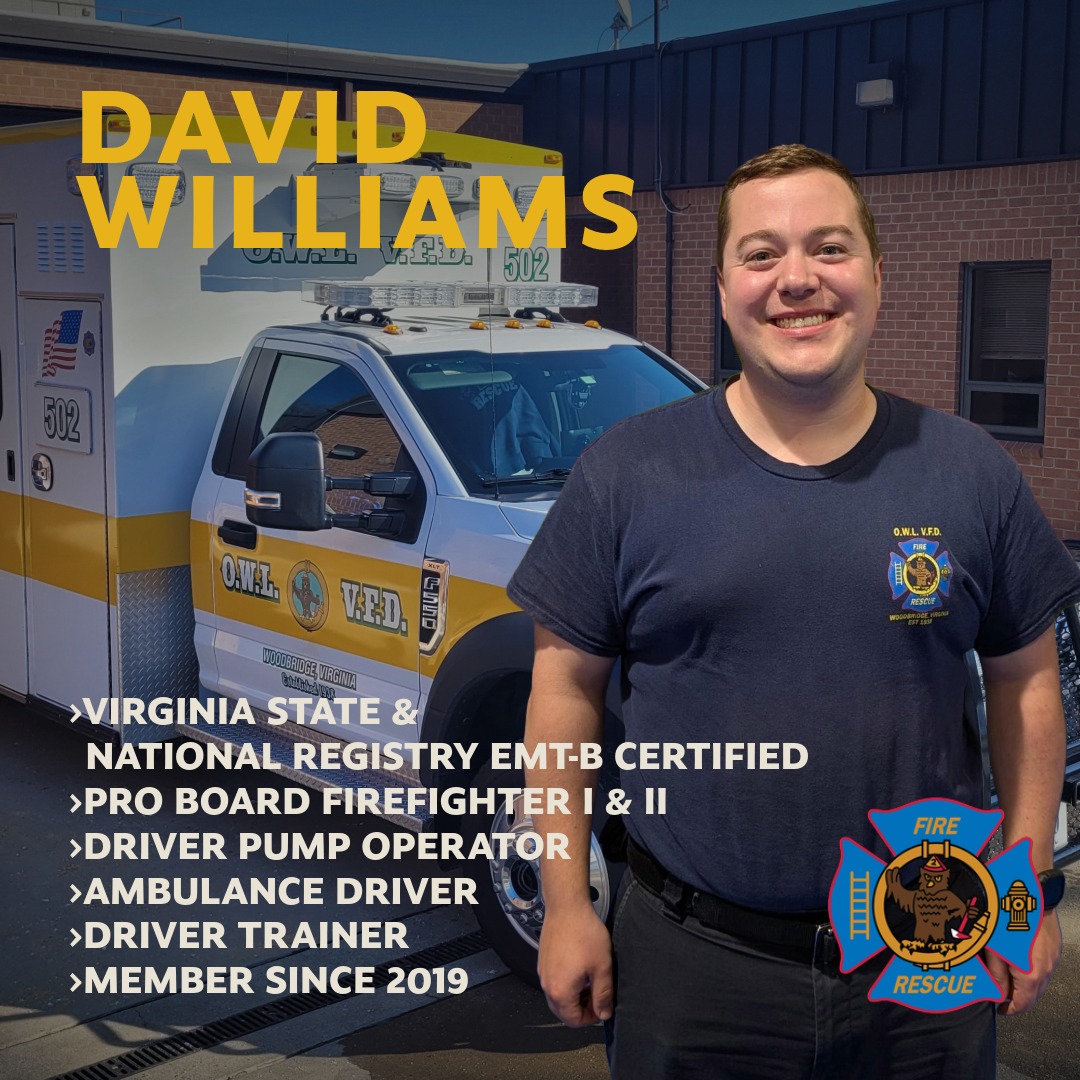 David joined OWL in December 2019 and quickly distinguished himself through both performance and leadership. He graduated top of his class in the Spring 2021 Prince William County Fire & Rescue System’s Volunteer Fire Recruit Class, and he has never stopped building on that foundation.